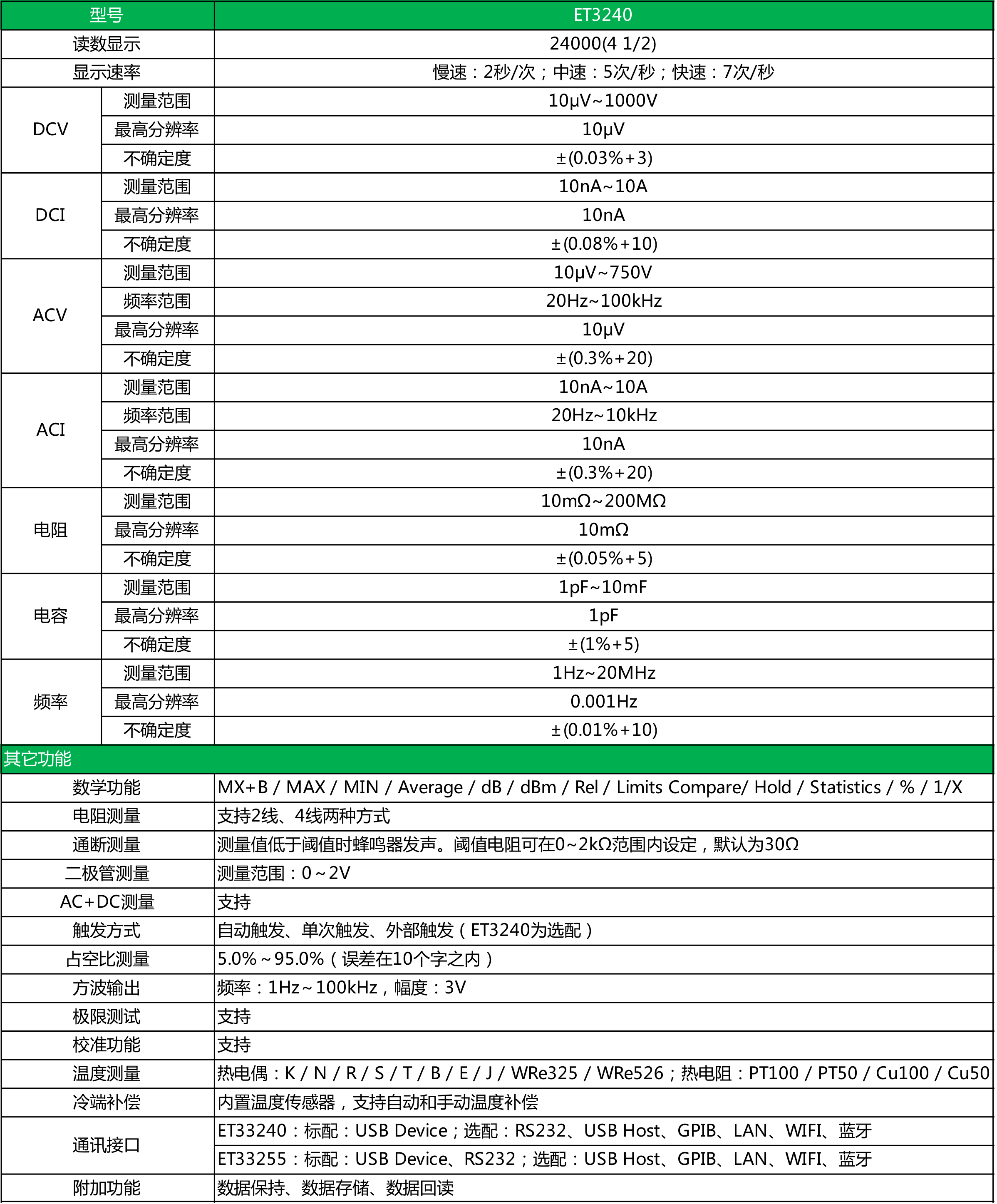 ET3240为功能全面、性能稳定的真有效值数字万用表,本系列台式万用表提供强大功能,出色的性能,良好的用户体验;3.5寸TFT液晶屏显示、读数清晰、内容丰富,具有良好的显示效果。本表采用市供电驱动使之成为高可靠性数字台表。全功能、全量程过载保护和独特的外观设计使之成为电工以及高校实验室的首要之选。