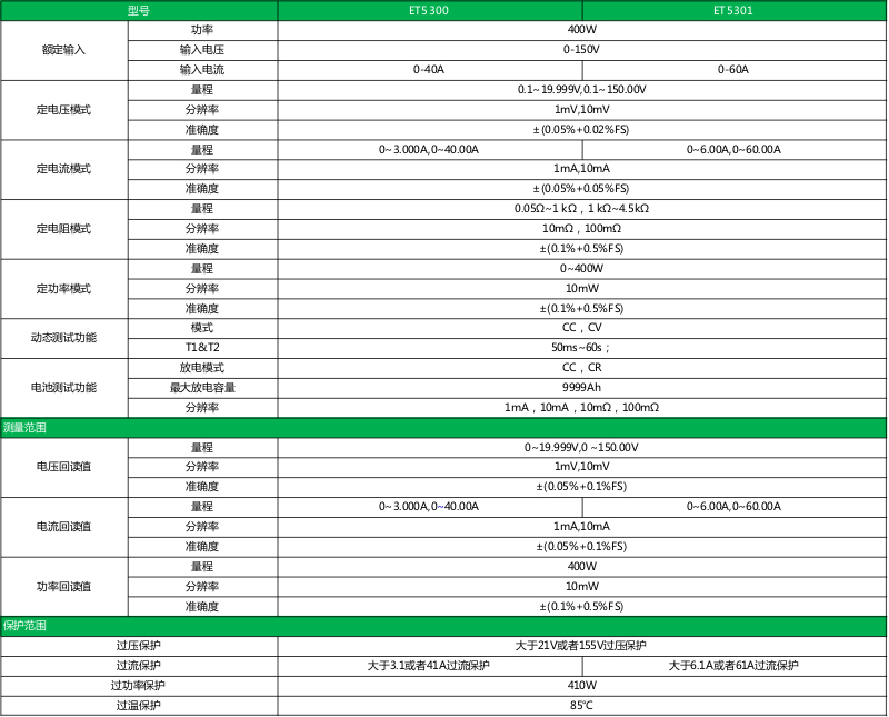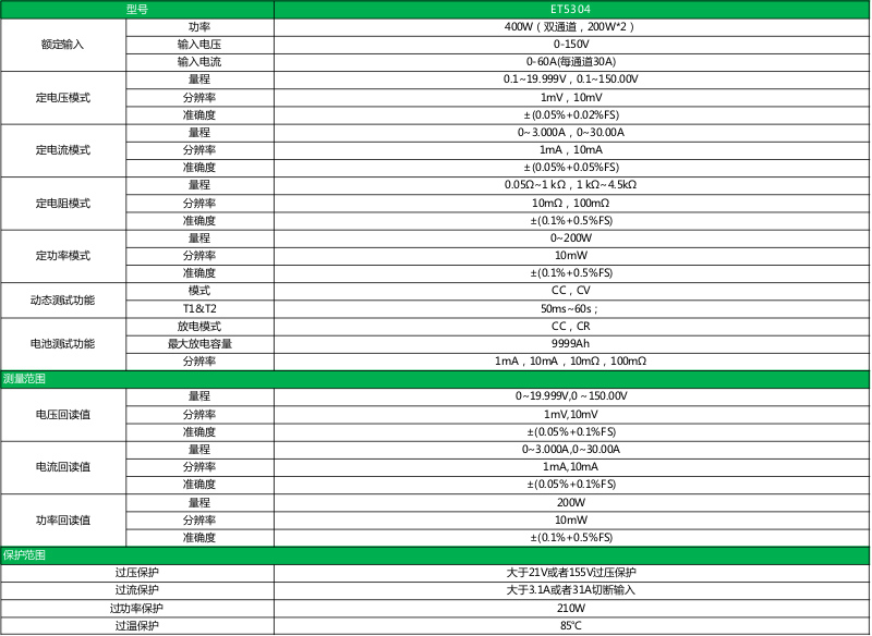 ET53系列单/双通道可编程直流电子负载,采用高性能芯片,高速,高精度设计,提供1mV、1mA的解析度,性能优越,可广泛运用于充电器,开关电源,线性电源,各类电池等行业的生产线测试,科研机构等试验研发领域。